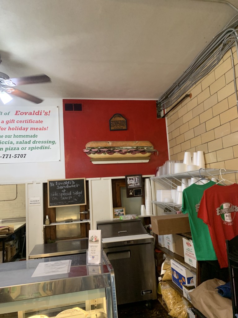 A walk inside of Mom’s Deli is like a walk back in time. Once you make it through the door (Assuming there isn’t already a line forming out the door and down the porch) you’re met with coolers of pasta, whole racks of lunch meat, shelves of chips, snacks, beer and wine and yes, Ted Drewe’s. I would guess that you could find some of these same things in the exact same spot 40 years ago. As the line snakes its way to the sandwich counter photos of store’s founders, the Vago family, as well as friends, patrons and community supporters are rested high above the coolers and sandwich boards. The menu itself is not a video monitor but rather a vintage slide-in kind of board like one you might find in a grade school gym. Something about the board makes the experience feel a bit more authentic.